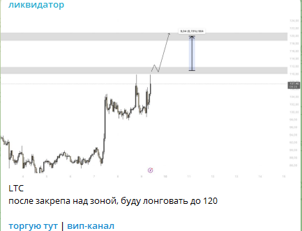 Еще в одной записи телеграма «Ликвидатор» блогер показывает технический анализ на графике LTC. Он указывает на конкретные уровни, по которым будет совершать сделки. Перед нами полноценный торговый сигнал. Однако при этом трейдер не демонстрирует детальную статистику своей торговли. Нет никаких доказательств тому, что сам он работает «в плюс» или хотя бы «в ноль» на длинной дистанции.