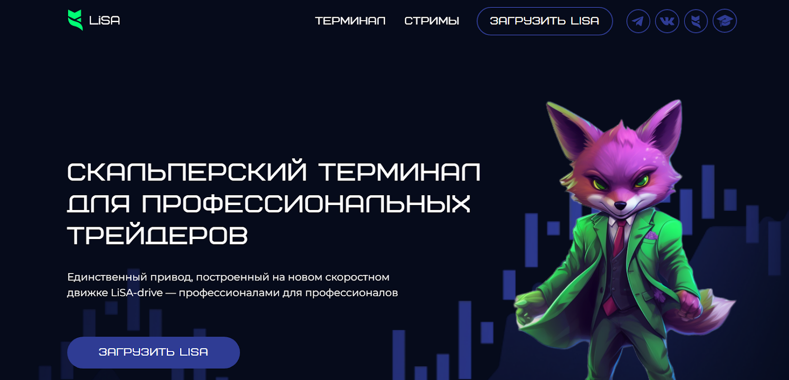 Для того чтобы ознакомиться с главными сведениями о проекте, нужно перейти на официальный ресурс Lisa Terminal ru. Он доступен на русском языке. Из разделов на платформе: Терминал, Стримы, Загрузить. Справа страницы представлены категории с социальными сетями (Телеграмм, Вк), а еще с обучением.
