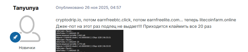 В Сети не слишком много отзывов о Litecoin Farm, поскольку он скомпрометировал себя с начала работы. Пользователь с ником glonter сообщает, что за полторы недели его активного посещения ресурса сайт сменил домен четыре раза.