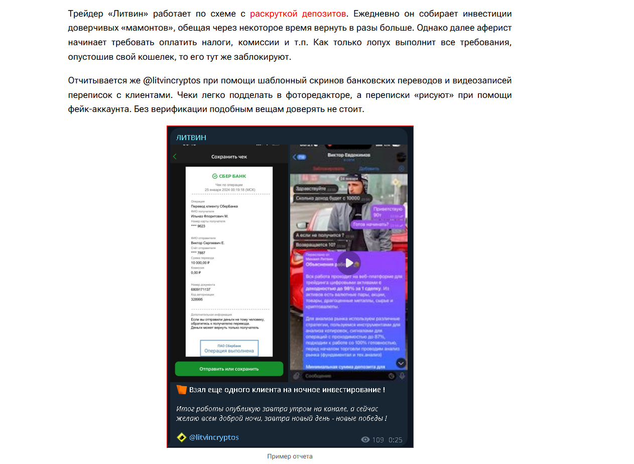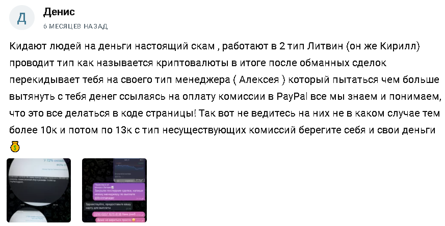 При этом стоит заметить, что участники не получали доступ к настоящей истории сделок, а выплаты часто задерживались или исчезали. Деньги переводились на реквизиты LitvinCryptos, а скриншоты истории котировок можно было редактировать, поэтому нельзя подтвердить, что показанная прибыль действительно существовала.Отзывы о «Литвин бот» в тг