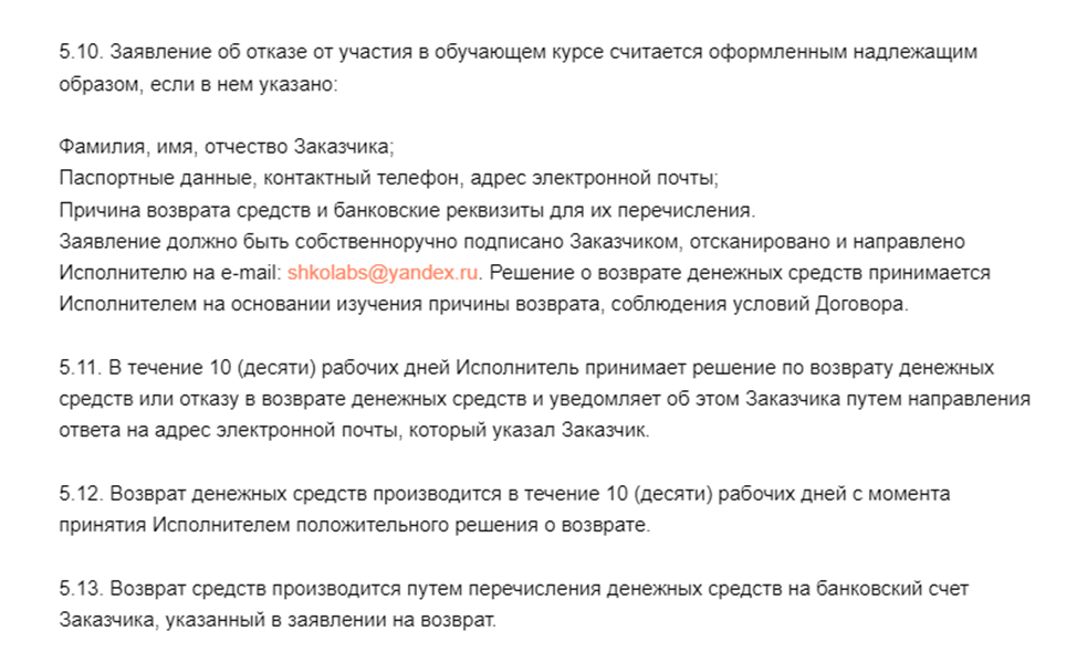 Все вопросы относительно возврата денег за обучения регулируются офертой, а также российским законодательством. Трейдер готова вернуть оплату на основании письменного заявления, правда, при условии, что клиент не получил цифровой ключ, дающий полный доступ к закрытой части сайта.