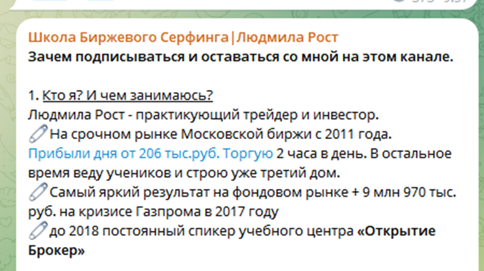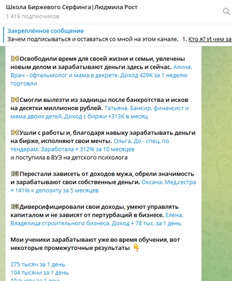 Людмила Рост не относится к топовым трейдерам, ее услуги не особо популярны у новичков. Но вероятно у нее есть клиенты, готовые платить за курсы и инвестиции, иначе она бы уделяла гораздо меньше внимания созданию постов в Телеграмме.