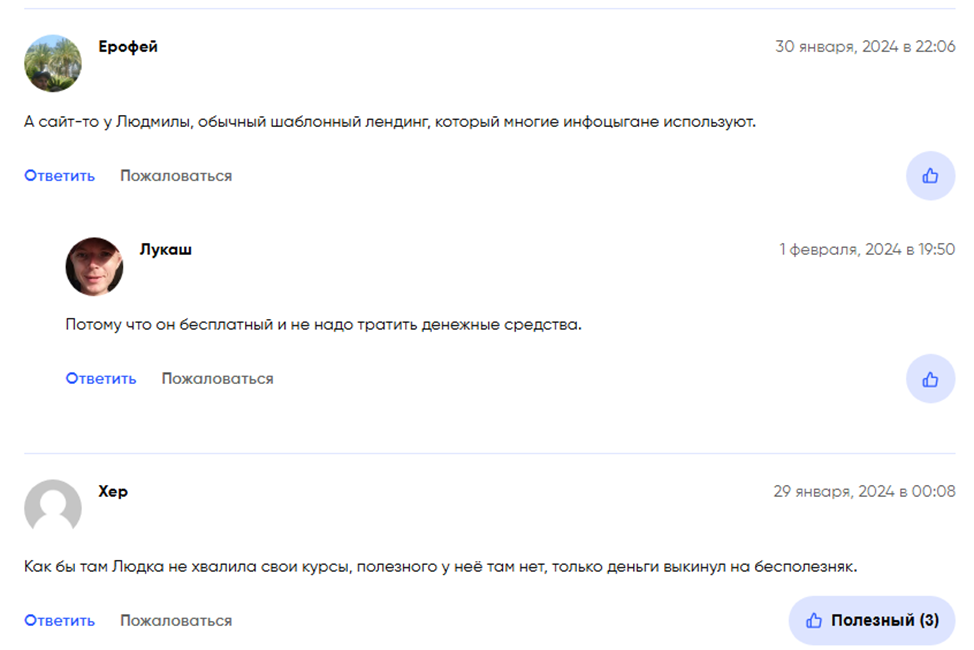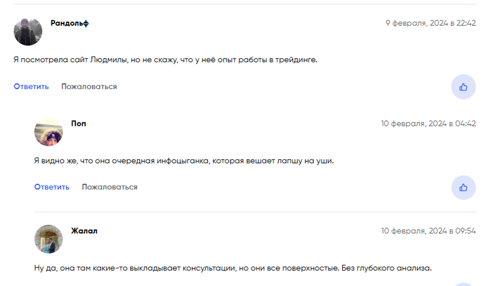 На специализированных брокерских сайтах читатели не разделяют официальные мнения о школе. Они пишут, что Людмила установила чрезмерно высокий ценник за базовые знания, которые можно найти в сети абсолютно бесплатно. Платные консультации носят посредственный характер, больше напоминают инфоцыганство.