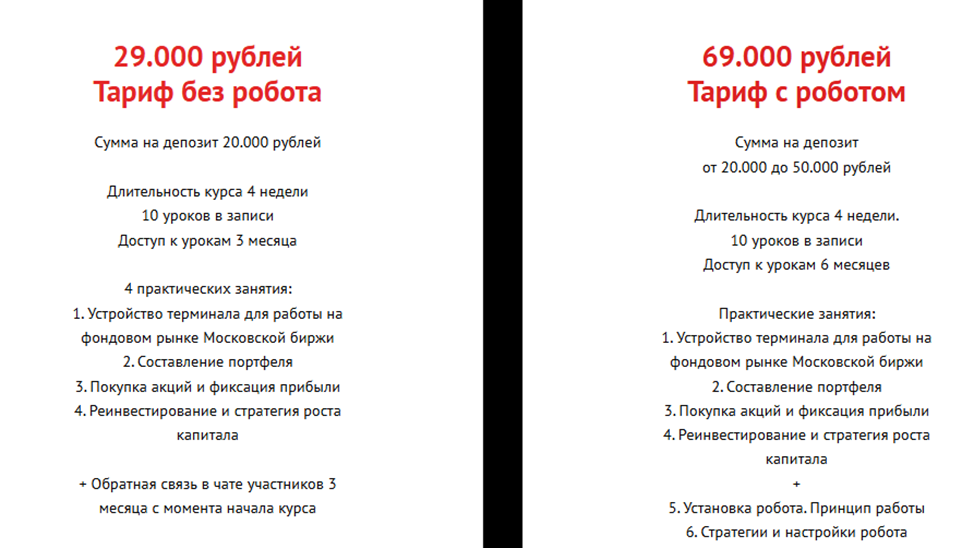 Программа состоит из нескольких образовательных модулей, стоит 29 тыс. рублей. Тем, кто хочет приобщиться к автоматизированной торговле, Людмила Рост за дополнительную оплату в 40 тыс. рублей готова передать программный продукт, а также обучить всем тонкостям настройки, позволяющим пассивно зарабатывать на автоматических сделках до 20 тыс. в день.