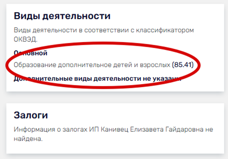 “Школа Биржевого Серфинга” оказывает платные услуги от лица ИП Канивец Е Г. Предприниматель действительно имеет право на создание курсов, но в ОКВЭД нет ни слова о доверительном управлении, инвестиционном консалтинге.