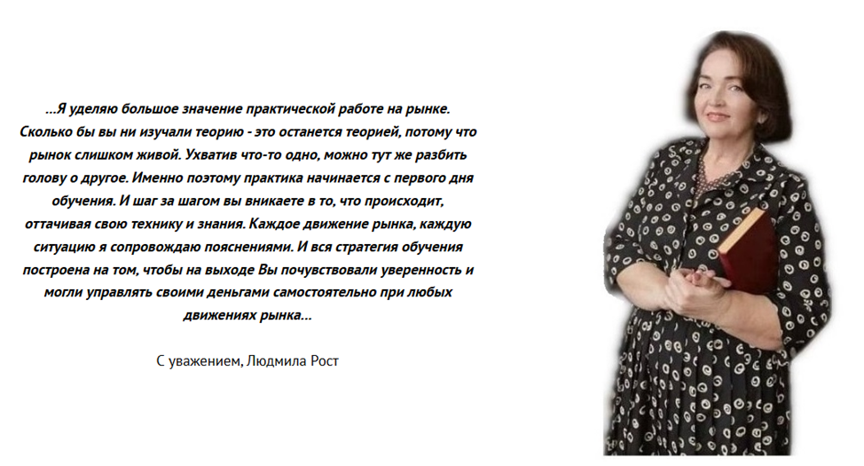 Людмила Рост заявляет себя трейдером, успешно работающем в отрасли с 2011 года. За это время она сумела аккумулировать капитал более 1 млн USD, построить 3 загородных дома. Набрав солидный практический опыт, инвестор перешла в разряд наставников, создав образовательный проект “Школа Биржевого Серфинга”.