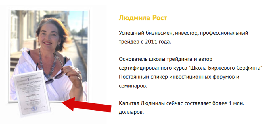 Школа Биржевого Серфинга Людмила Рост предлагают качественное обучение трейдингу и быстрый выход на стабильный доход, позволяющий забыть о низкооплачиваемой основной работе. По заявлению автора вся трансформация занимает всего 1 месяц. Мы изучили деятельность образовательных курсов, их конечных бенефициаров, узнали, способен ли эксперт выполнить свои обещания.
