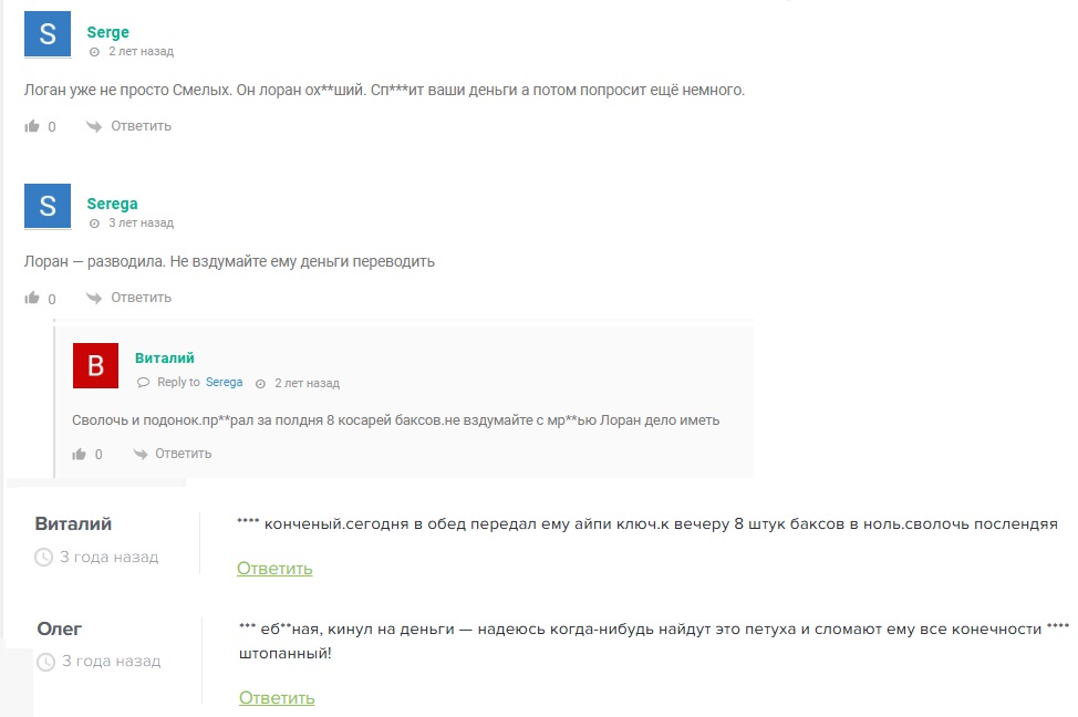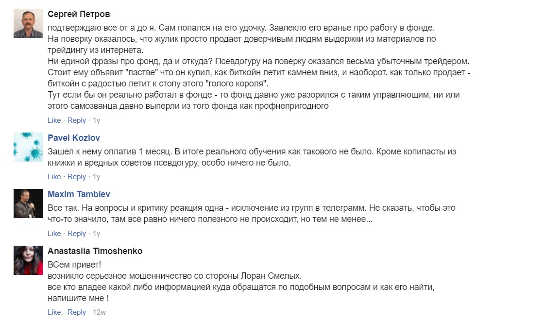 В сети есть большое количество отзывов о деятельности Лорана Смелых, все они негативные. Пользователи уверяют, что трейдер быстро слил их депозит и требовал дополнительных платежей. По всей видимости, он действительно нашел свою стратегию — учиться трейдингу на чужих деньгах, а в случае успешных сделок получать свой процент прибыли.