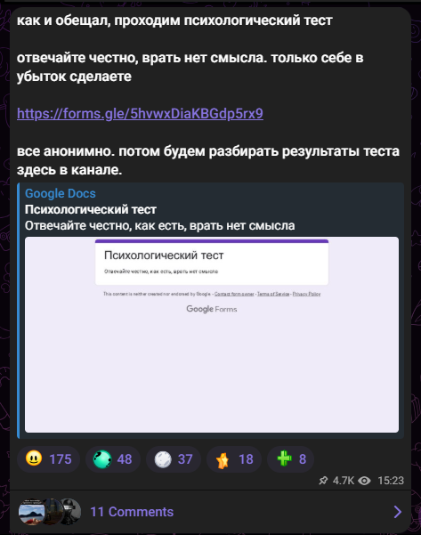 В закрепленных постах Ilya Lugvin оставляет ссылку на прохождение психологического теста. Он проводился анонимно. Сам же трейдер обещал провести разбор результатов на канале.