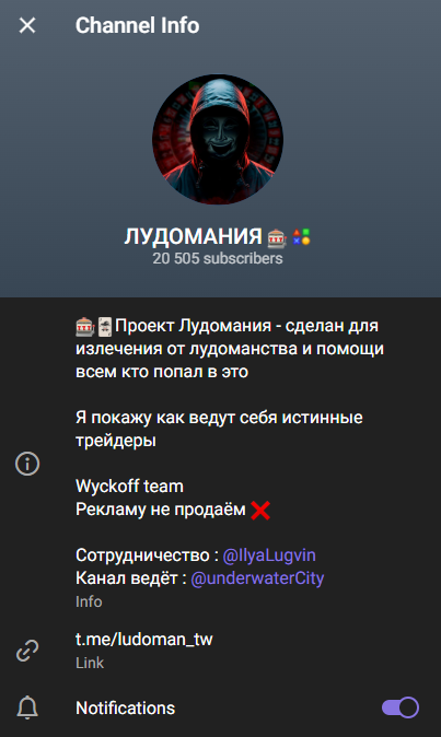 Илья Лугвин – трейдер, позиционирующий себя опытным и успешным игроком финансового рынка. Его проект Ludoman tw создан для оказания помощи в излечении от лудомании. Сам админ Wyckoff обещает поделиться эффективными методами торговли – как покупает и продает цифровые активы с максимальной прибылью и минимальными рисками. В обзоре проанализируем авторскую систему заработка, активность подписчиков и репутацию проекта за пределами мессенджера.