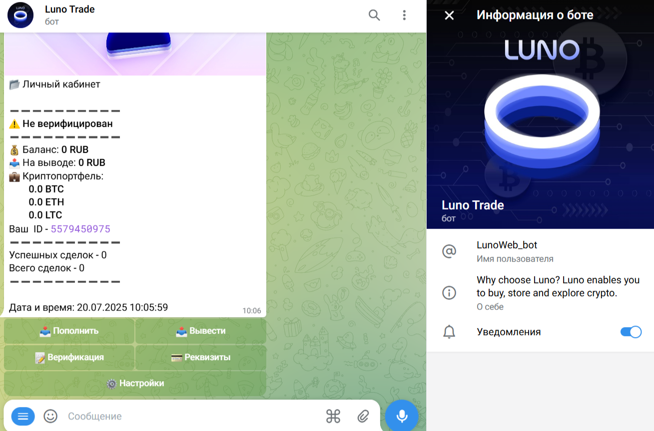 Проверка интернета не помогла нам определить точный возраст бота Luno Trade. Судя по датам публикаций негативных отзывов проект появился в первой половине 2025 года.