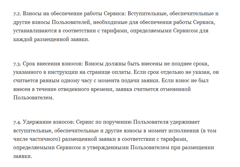 Из информации, представленной пользовательским соглашением, читатели могут узнать, сервис требует оплату вступительных, обеспечительных и других взносов. Они должны быть внесены не позднее срока, упомянутого в инструкции оплаты. Какова величина платежей можно узнать после верификации и начала сотрудничества с проектом.