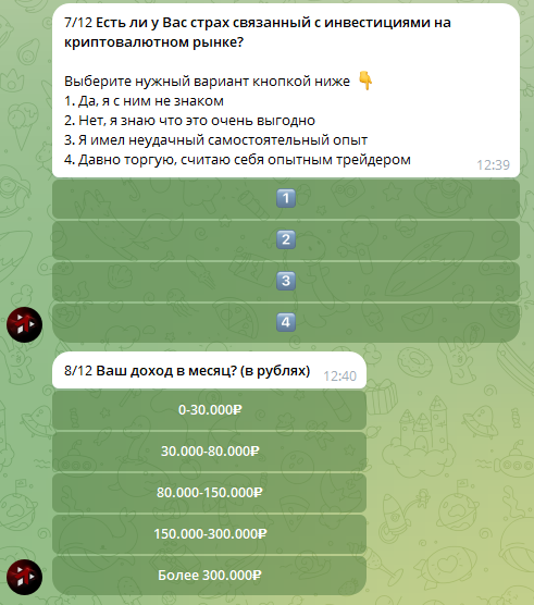 После этого Бот инвестиционной компании MacrosMatic присылает клиенту анкету. И это одна из частей развода. В анкете мошенники пытаются выяснить имя, возраст и пол потенциальной жертвы. А также есть ключевые вопросы – какой уровень дохода в месяц у потенциального инвестора, и какой у него опыт в инвестировании. Эти сведения нужны мошенникам, чтобы понять уровень финансового состояния будущего клиента.