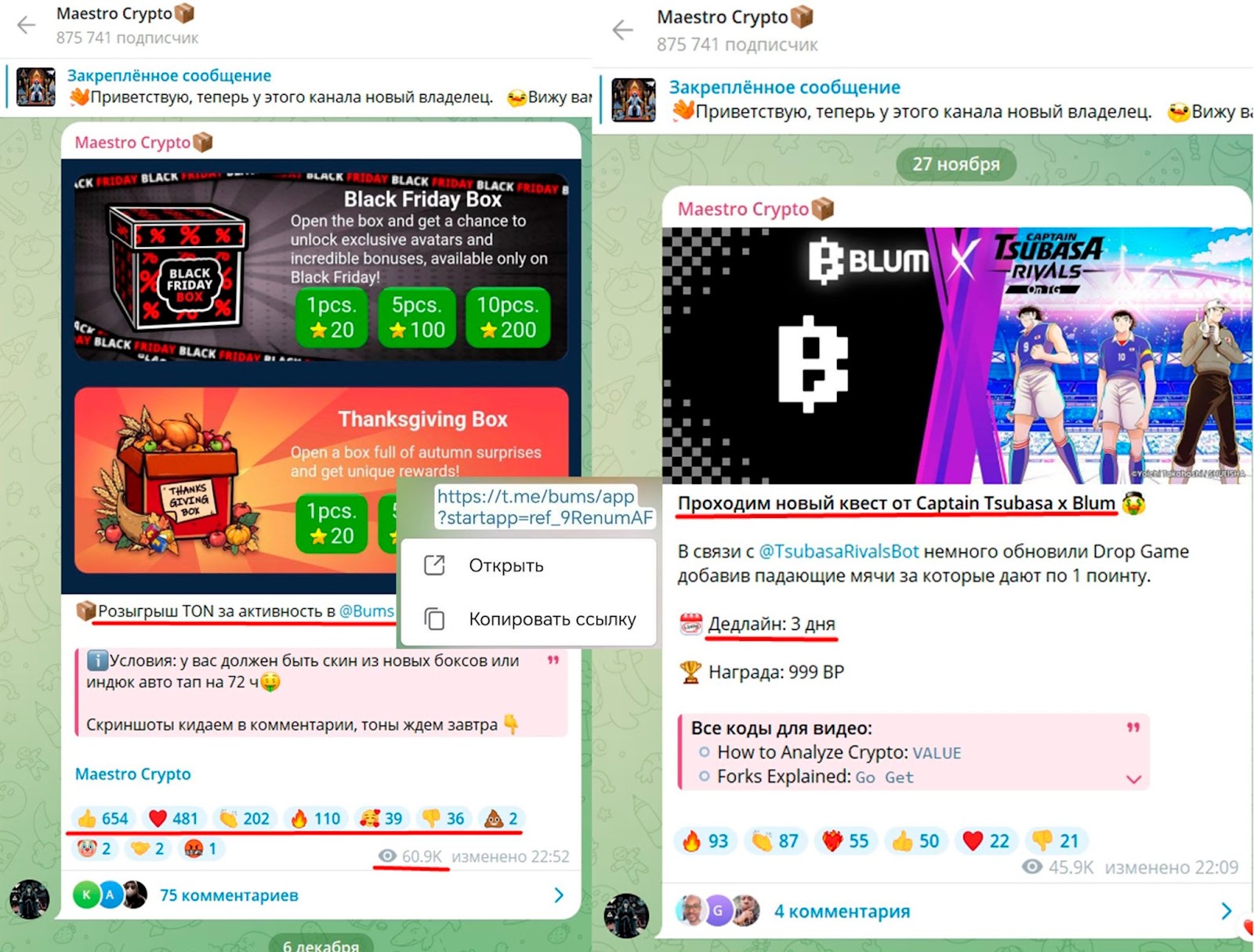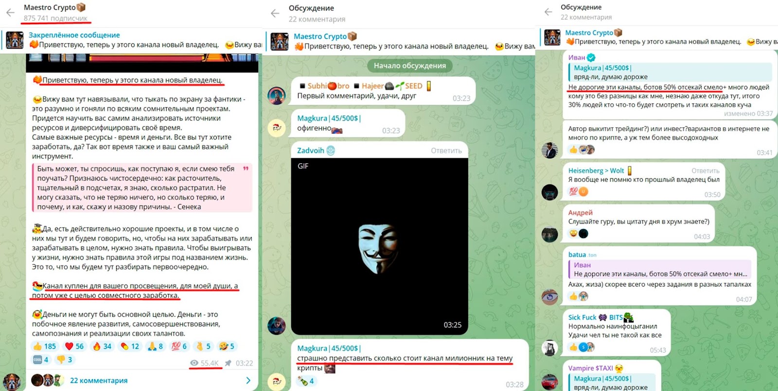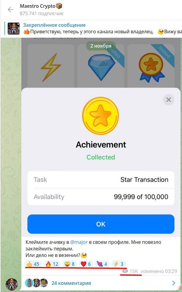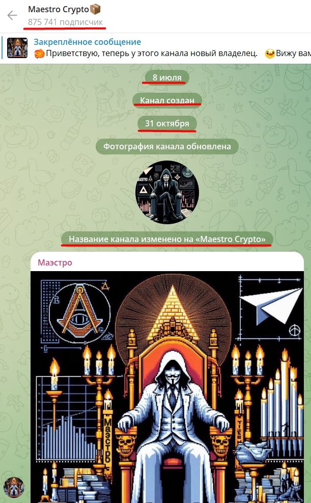 Maestro crypto — это канал в тг, который был перекуплен 31 октября 2024 года. На проект подписано 875 тысяч пользователей. Изначально канал был создан 8 июля 2024 года, но найти данные о предыдущем владельце — затруднительно. В комментариях под первым постом подписчики пишут нейтральные отзывы и спрашивают об инвестиционных затратах на канал-миллионник.