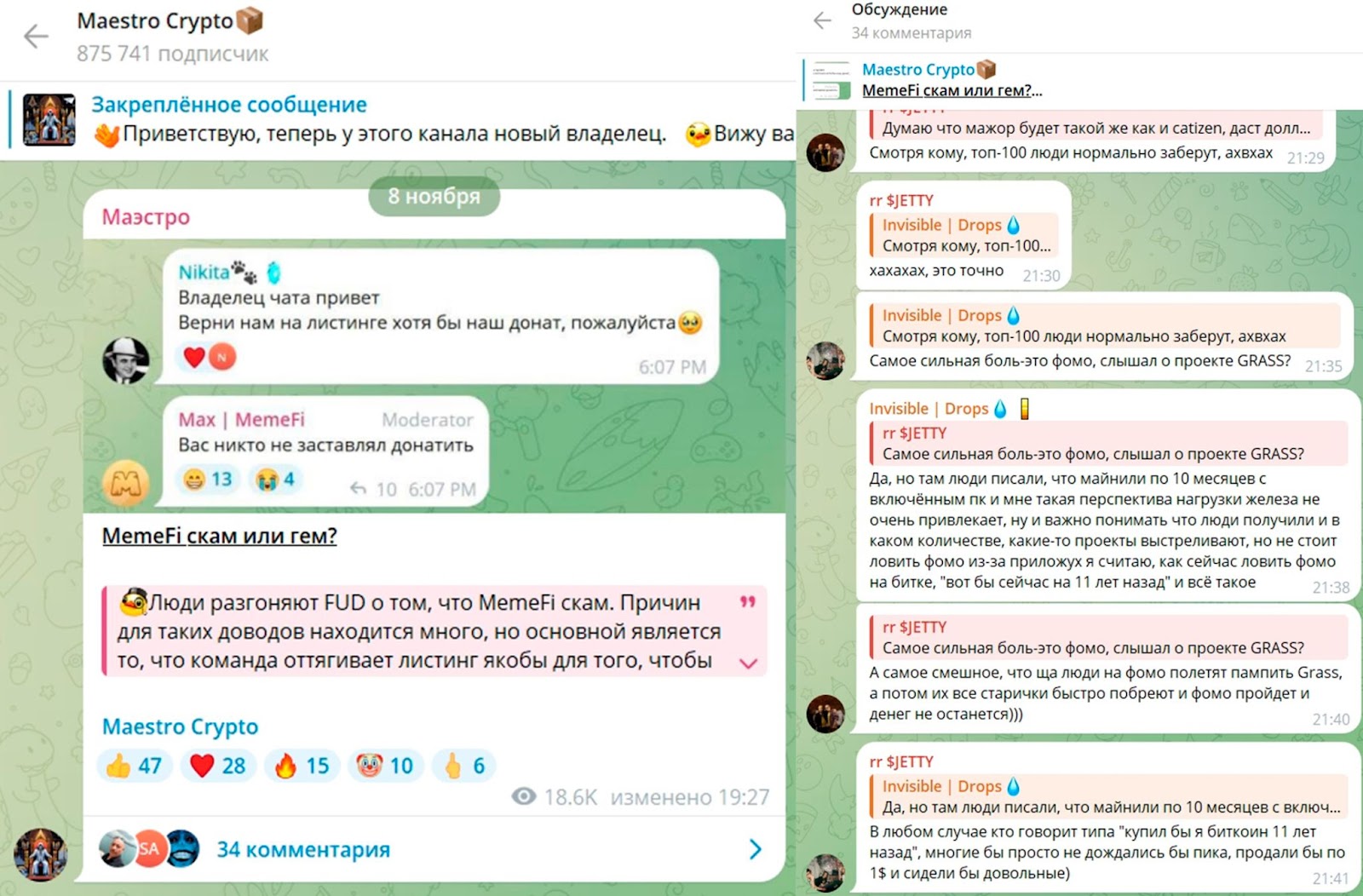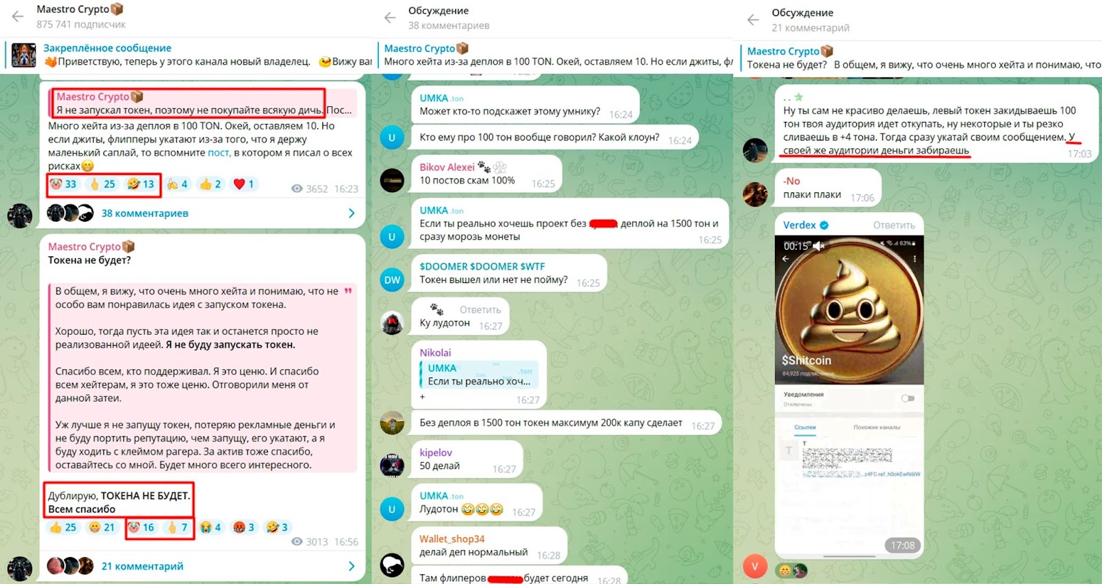 В последних постах админ рассказывал про запуск мемтокена. Но из-за хейта и негативных комментариев аудитории MaestroCrypton решил публично отменить проект. Плюс, подписчики прямо указали, на попытку админа заработать деньги на канале мошенническим способом. Подобные инвестиции помогают заработать только первым вкладчикам, как в известном и базовом методе финансовых пирамид.
