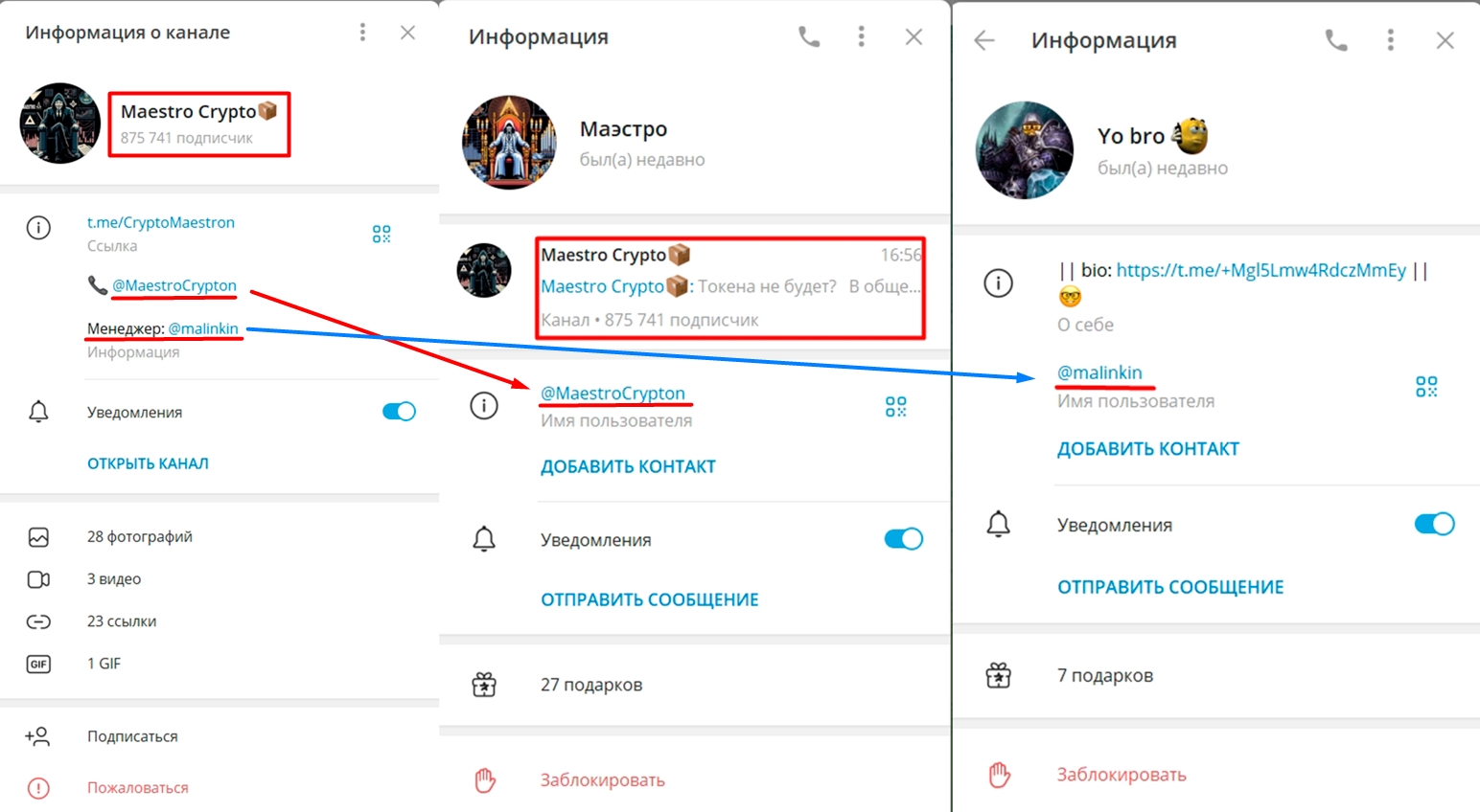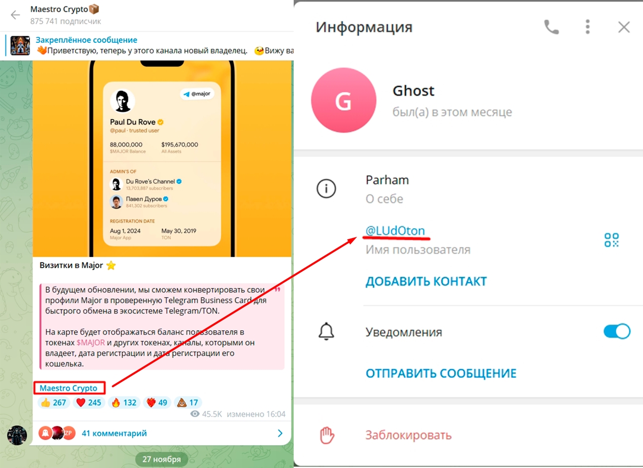 В конце постов в тг можно заметить ссылку с названием maestro crypto. Но ссылка перенаправляет на новый профиль с ником ludoton. О роли этого сотрудника канала не сообщается.