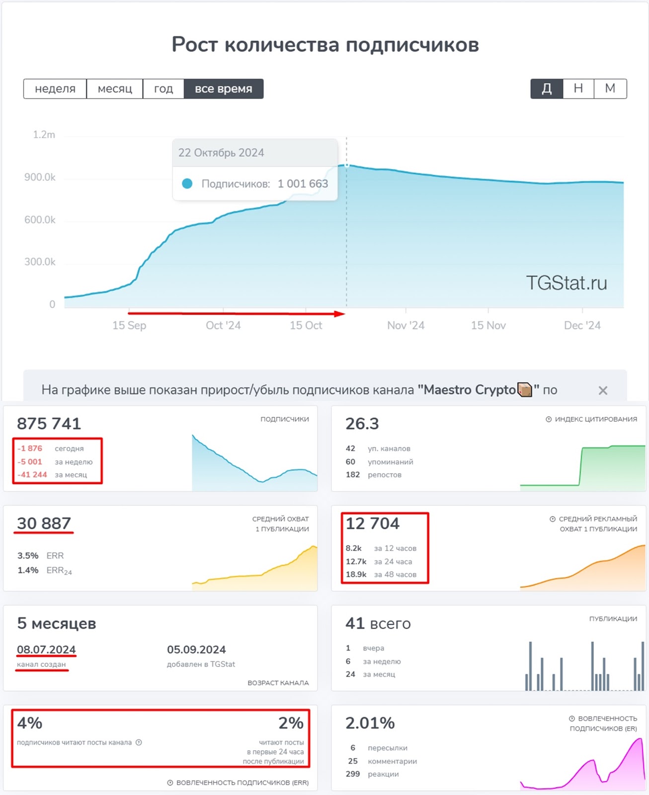 На специализированных сервисах можно проверить статистику и активность в телеграм-канале маэстро крипто. До покупки канала с 15 сентября по 15 октября 2024 года количество подписчиков возросло от 150 тысяч до 1 миллиона. Например, без рекламы и раскрутки подобный рост можно обеспечить тапалкой с ретродропом. Но предыдущий владелец канала решил его продавать после накрутки 1 миллион пользователей, после чего отписалось 125 тысяч юзеров.