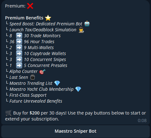 В чем же вообще выгода создателей Maestro Sniper Bot? Ну во-первых, за использование своих функций бот требует комиссию 1% за каждую транзакцию. Однако это не все, используя, обычную версию, вы не имеете доступа к основным полезным фишкам. Они открываются только при покупке Premium, а это еще 200$ в месяц к комиссии. И это за очень сомнительные возможности. полезность которых пользователи не всегда подтверждают.