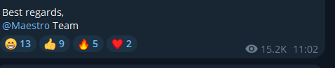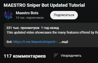Маэстро Снайпер бот представлен во многих соцсетях от Twitter до YouTube. Основными из них являются телеграм-каналы, их несколько. Содержание канала – это различные обновления и новости касательно ботов, никакой ценной аналитической информации вы здесь не найдете. В целом, охваты в каналах неплохие, но возникают некоторые вопросы. Например, в тг-канале Maestro Hub, где 180 тыс. подписчиков, на постах набирается по 15 тыс. просмотров. Результат подозрительный. Негативные реакции и комментарии здесь тоже почему-то отключены, а положительных реакций здесь не так уж и много – нет и 30 на записи с 15 тыс. просмотрах.