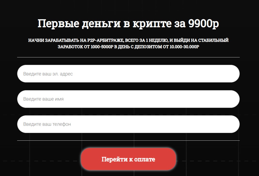 Для приобретения интенсива требуется указать адрес электронной почты, имя и телефонный номер. Контент интенсива, скорее всего, дублирует бесплатные ролики. Никакой конкретики арбитражник не предлагает. Доступны лишь общие темы, по самой базе – что такое P2P-торговля, как безопасно покупать и продавать криптовалюту, как не нарваться на мошенников и как работать без использования своих карт.