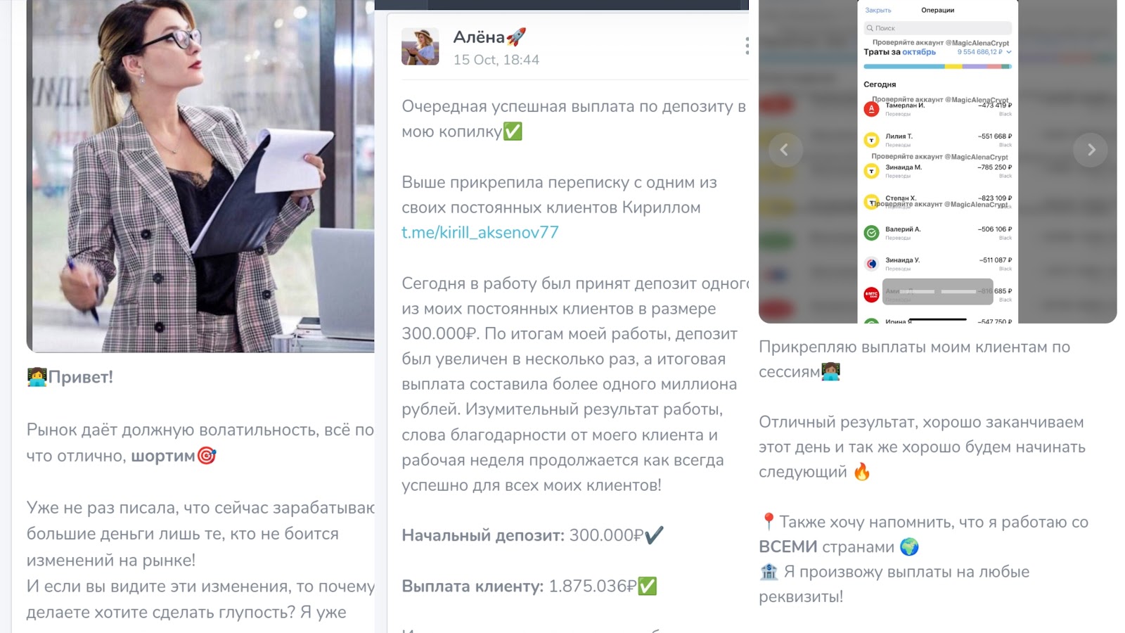 Создатель блога не предлагает платного обучения. Главная услуга инвестора — доверительное управление. Девушка проводит наборы на торговую сессию, где увеличивает вложения инвесторов. По идее, клиент должен отправить смс Алене и дождаться ответа. Далее автор примет инвестиции в управление и начнет торговлю. По ее окончанию прибыль якобы будет отправлена пользователю. Как пишет админ, она работает с разными странами. Выплачивают средства также на любые реквизиты. Допустим, Алена Magicalenacrypt может перевести деньги на ВТБ, КИВИ, Альфа банк, Душанбе Сити и прочие. Для того чтобы вызвать заинтересованность у инвесторов, девушка рассказывает о результатах торговли. Например, с депозитом в 300 000 рублей человек якобы получил 1 875 036 рублей выплат. Такие отчеты не подтверждены, и их можно подделать в редакторе. Кроме того, настоящие трейдеры не будут гарантировать увеличение средств во множество раз.