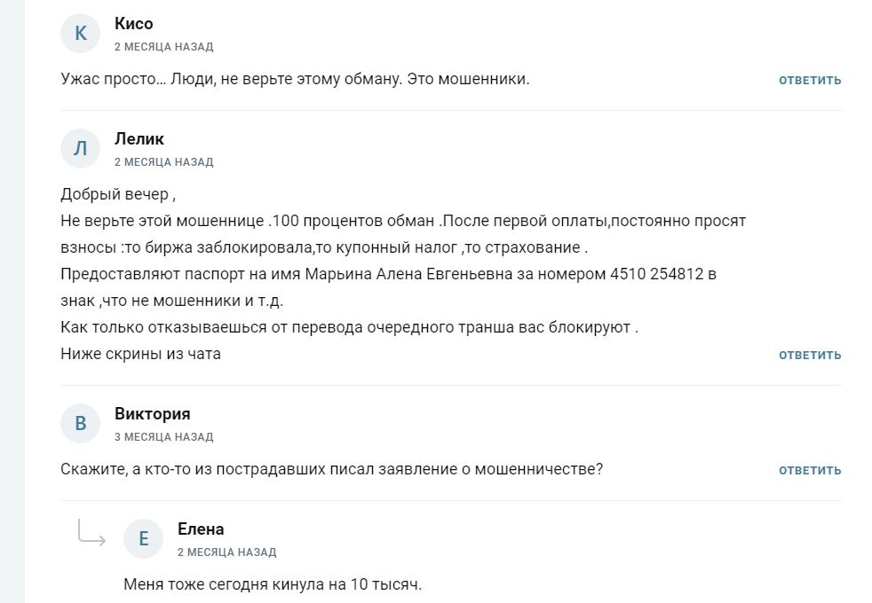 Алена не предоставляет верифицированную статистику по сделкам и не демонстрирует инвестиционного портфеля. Она пытается убедить в честном сотрудничестве, но в реальности создает новые проекты и разводит людей на деньги. Помимо основных депозитов, автор будет просить платить налоги и комиссии. Признаки мошенничества: