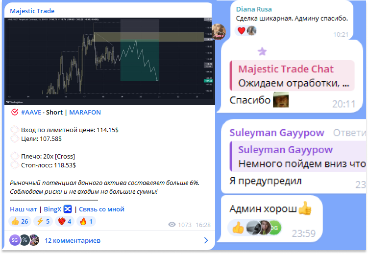 По сделкам Majestic Admin заходят довольно редко, часто подписчики останавливаются на паре вопросов админу, на которые он охотно отвечает, даже если дело касается технических моментов, вроде выставления тейка. Это настолько удивительно – бесплатное объяснение банальных и простых вещей, что даже подозрительно.