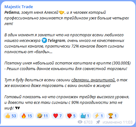О телеграмм-канале Маджестик Трейд у нас сложилось положительное впечатление, однако доверия к админу мы не питаем: мотивация админа никак не вяжется с образом успешного трейдера – кому и что профессионал будет доказывать? К тому же с сигналов он заработает максимум процент с рефералки, ведь нахождение на канале бесплатное.