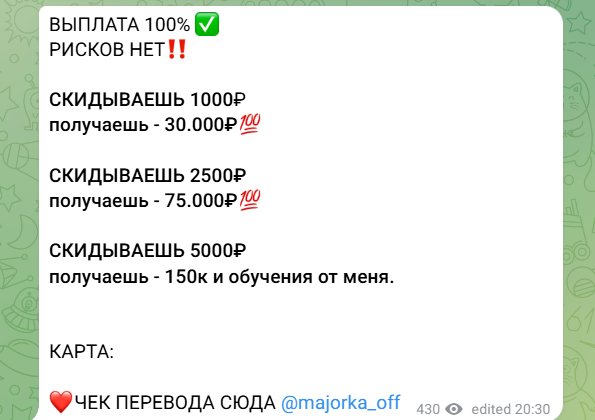 В условиях сотрудничества говорится, что клиенту нужно вложить 1000, 2500 или 5000 рублей. Деньги переводятся на карту героя материала, после чего нужно скинуть скрин выплаты в профиль. Дальше вложенные средства преумножаются, а на выходе клиент видит уже 30 000, 675 000 или 150 000 рублей.