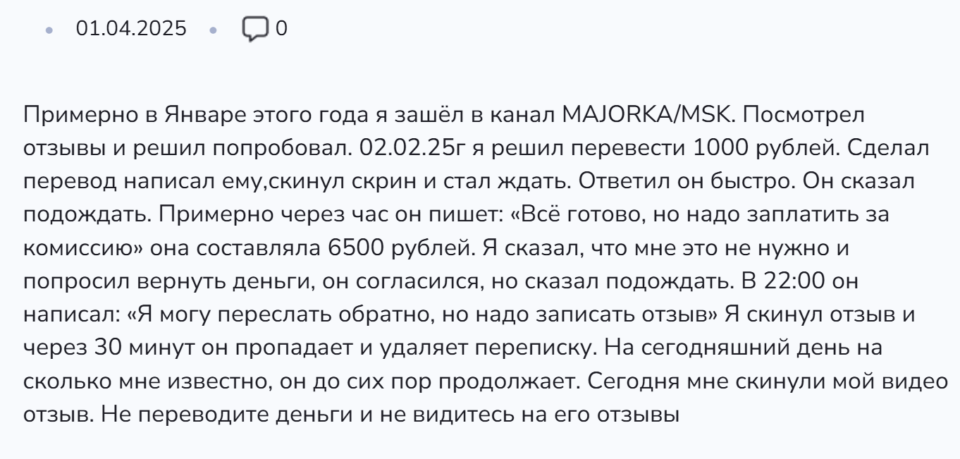 Изучение отзывов о Majorka Msk показывает недовольство клиентов качеством работы проекта. Один из пользователей рассказывает, что решил перевести 1000 рублей. Он провел транзакцию и весьма быстро получил ответ. Автор канала потребовал оплаты комиссии в размере 6500 рублей. Клиент сказал, что не заинтересован в дальнейшем сотрудничестве и попросил вернуть деньги. Создатель канала согласился, но потребовал сначала написать положительный отзыв, а потом и вовсе пропал.