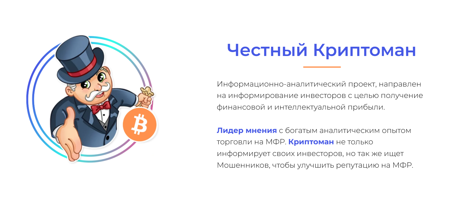 Честный криптоман — проект, в котором автор опроверг название и оказался банальным аферистом. Под красивыми обещаниями обучения и поддержки клиентов скрывает банальное желание присвоить их деньги при покупке крипты. Плюсов нет, минусов полно: