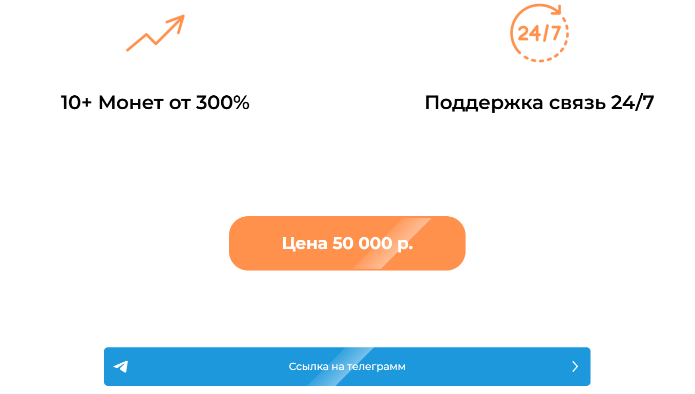 В стоимость услуги входит круглосуточная поддержка, а также список из более чем десяти монет с потенциалом роста х3. Цена составляет 50 000 рублей, является ли оплата единоразовой или придется вносить сумму каждый месяц, информации нет.
