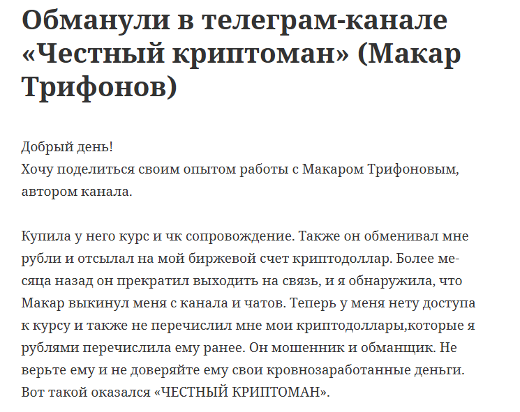 Трейдер Макар Трифонов работает через приватные чаты и каналы в Телеграмм, также у него есть сайт с рекламой услуг. О молодом человеке практически нет сведений: образование, опыт, квалификация в качестве рыночного игрока и прочие данные отсутствуют. При этом он выступает в роли наставника, предлагая обучение трейдингу, а также готов сопровождать клиента до результата с нуля. В настоящее время его основной аккаунт Criptoman Russia удален, вероятно, слишком много жалоб поступало от обманутых подписчиков. Но это не дает гарантию, что Макар не создаст новые адреса для развода пользователей на деньги, его сайт до сих пор функционирует, хоть и содержит устаревшую ссылку на Телеграмм.
