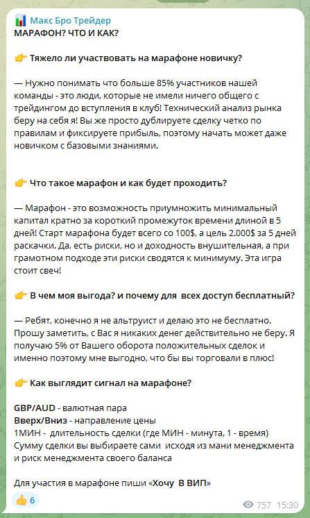 Трейдер предлагает участие в марафоне, где инвесторы начинают с $100 и якобы за 5 дней гарантированно получают $2000, следуя его торговым сигналам. Анализ рынка и рекомендации берет на себя трейдер. Участие бесплатно. Макс получает 5% от успешных сделок. Это развод, поскольку заработок @maxbrotrader – это откаты от Pocket Option, на сайте которого клиенты должны сделать первый депозит.