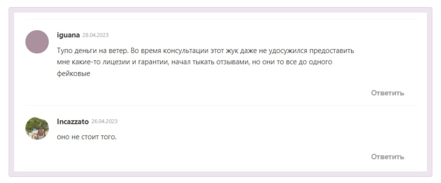 Мы также обнаружили схему развода, которую описывают клиенты, оплатившие частную консультацию от Макс Бро. Все обещания трейдера не подкрепляются лицензией. Судя по словам клиентов, он дает обещания, которые невозможно выполнить. Например, он утверждает, что по его стратегии убытков не бывает. Это фейк.