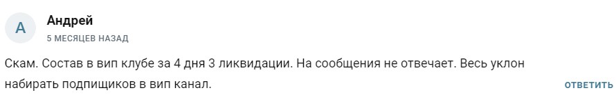 Судя по отзывам пользователей, не умеет торговать, а по результатам сигналов из випки получается минус. Упоминает о закрытом канале редко, отчеты из него также не выходят.