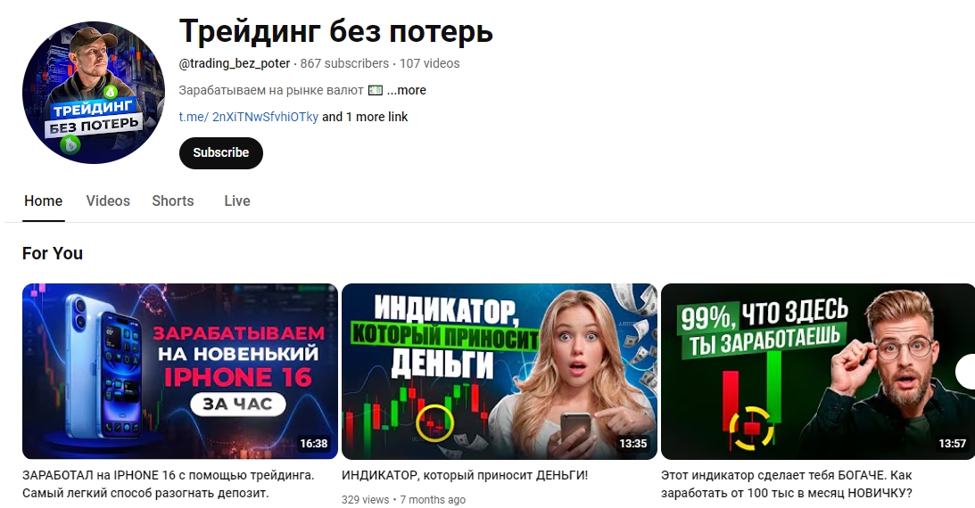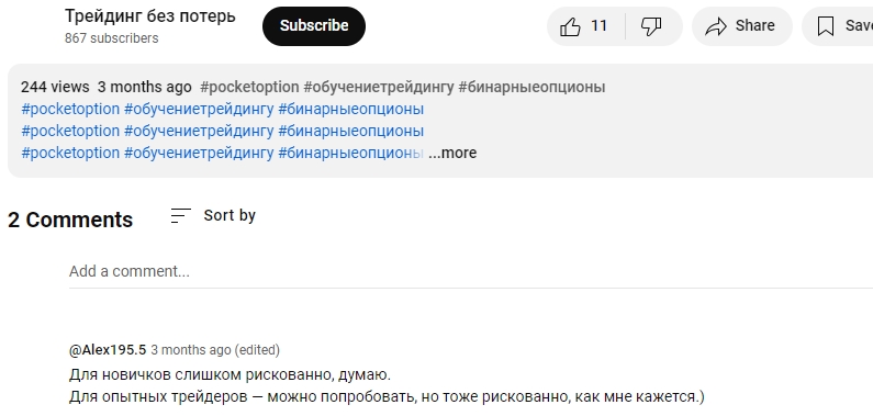 На YouTube канале Трейдинг без потерь на 600 просмотров видео приходится по несколько комментариев. Также трейдер ведёт группу Вконтакте – trader bezpoter.