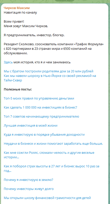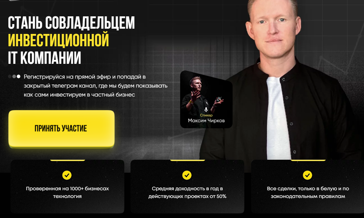Еще одна услуга Чиркова – проект «Стань совладельцем инвестиционной IT компании». Спекулянт предлагает возможность зарегистрироваться на прямой эфир и попасть в закрытый Телеграм-канал Maxchirtop. В нем команда проекта делится информацией о том, как они сами инвестируют в частный бизнес. Участникам предлагают пройти мастер-класс Investra, где раскроются проверенные технологии, успешно использованные в более чем 1000 бизнесах. Цель проекта — помочь людям перейти от работы по найму к собственному прибыльному IT-бизнесу.