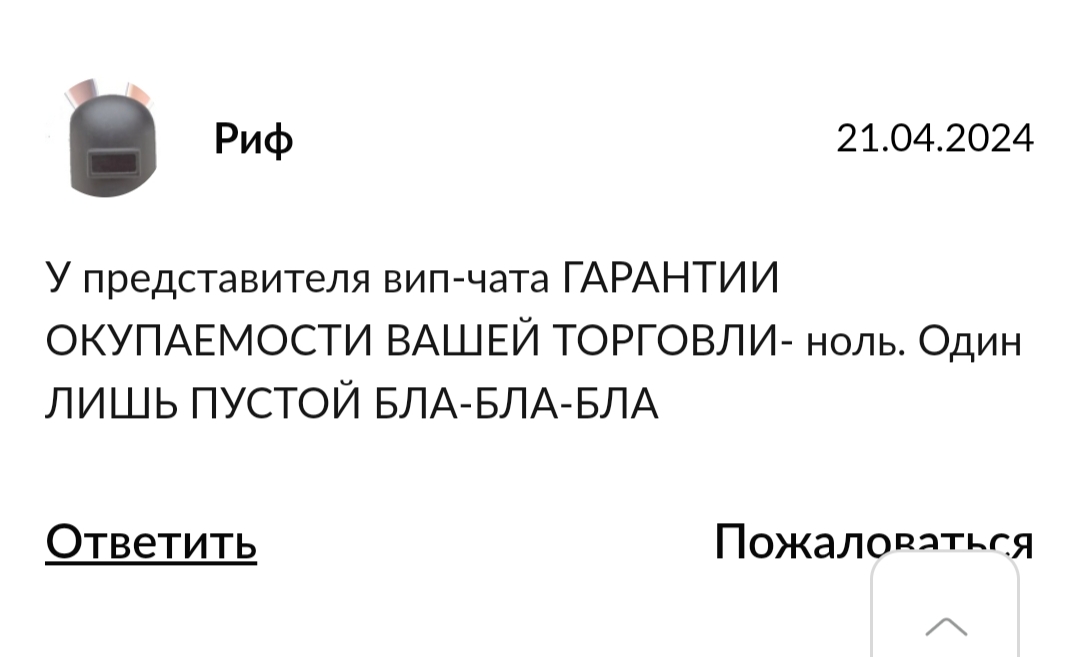 Риф оставил отрицательный отзыв о негативном опыте общения с админом вип-чата. Заработать настоящие деньги по методам и системе, которые предлагались, не вышло.