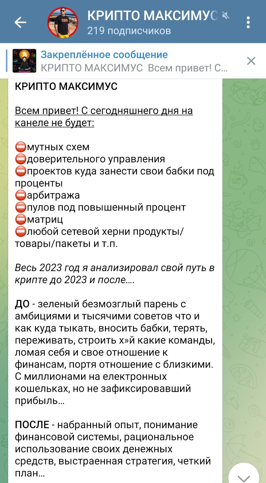 Жаль, что я раньше не знал о прошлом Максима Оказывается он уже давно людей разводит на бабки, ещё говорит что якобы исправился Нет, такие точно не исправляются У меня тоже так получилось что подписался на вип-канал и получил абсолютно бесполезные схемы