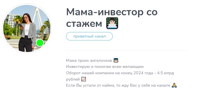 О канале в Телеграм Мама инвестор со стажем отзывы отсутствуют, но аналогичный контент размещают мошенники – проверим канал на подозрительную деятельность. Аккаунт автора в Телеграмм – mamainvesta, Ольга работа (также известная как Карина). Рассмотрим услуги мамы инвестора более детально.