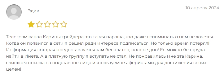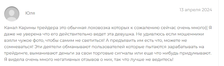 Отзывы про Телеграм канал Мама инвестор со стажем в сети ещё не появились, но благодаря тому, что Ольга-карина наследила за собой разными аккаунтами, можно почитать, что пишут о шарашке аферистов участники других каналов. Дисклеймер: ничего хорошего.