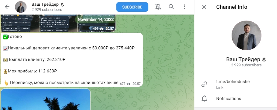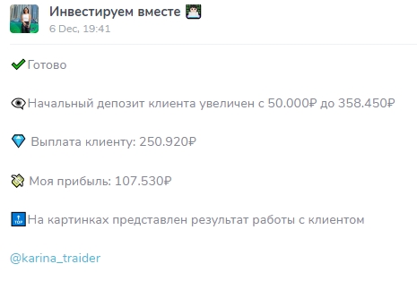Аферисты предлагают раскрутку счёта, при этом мошенники повторяют на разных каналах одни и те же примеры вложенной суммы, дохода клиента и заработка автора проекта. В телеграм канале Мама инвестор со стажем посты посвящены статистике доходов, мотивации, лживым отзывам и фейковой истории успешной женщины, которая 8 лет без устали гребла к статусу опытного инвестора. Забегая вперёд скажем, что Мама инвестор со стажем меняет названия своих ТГ каналов как перчатки, возможно, у неё действительно ушло восемь лет на такой невероятный труд.