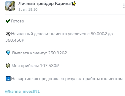 Также Мама инвестор со стажем или Ольга-Карина вешает всё ту же лапшу на уши доверчивых пользователей на канале Личный трейдер Карина, аккаунт karina investN1.