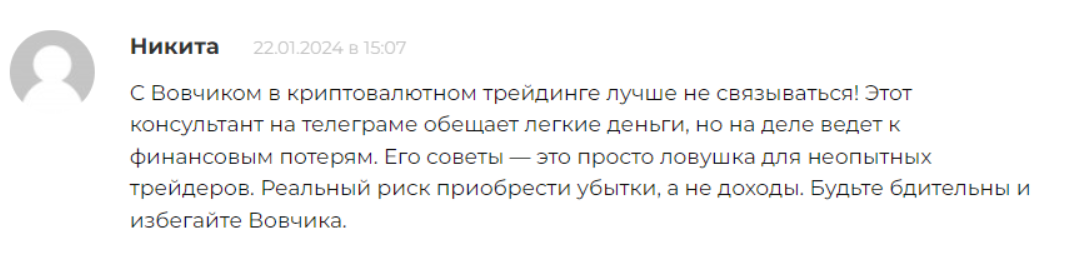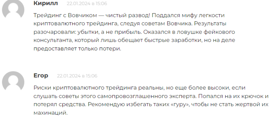В интернете о Вове высказываются плохо. Его обвиняют в разводе на деньги. Пишут, что его сигналы нерабочие. Все, кто следовал его рекомендациям, теряли свои вклады. С найденными в сети отзывами можно ознакомиться ниже: