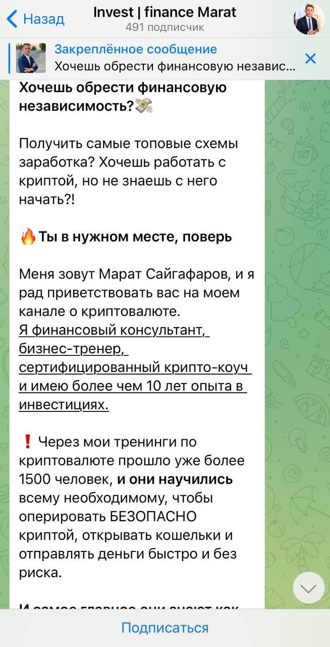 Марат Сайгафаров является одним из множества Телеграм-блогеров, который на самом деле не является трейдером. В его канале много мотивирующих постов и мало конкретики об условиях обучения