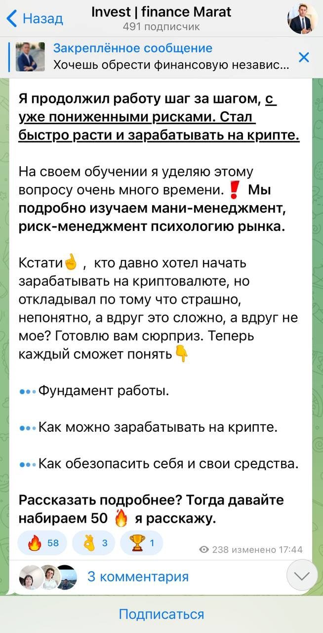 В канале можно найти амбициозные заявления, но они не подтверждаются никакими фактами, например, отсутствуют доказательства количества обученных людей и опыта в трейдинге.Контент в Телеграме разделен на категории для новичков и опытных трейдеров, где публикуются новости, тренды, инструкции и примеры заработка на криптовалюте. Стоимость платной услуги обучения составляет 2 990 рублей в неделю. Аудитория канала составляет около 500 человек, и администратор проводит розыгрыши денежных призов, чтобы стимулировать вовлеченность аудитории. Инвестор также делится результатами своих учеников, публикуя их обратную связь на специально созданном Телеграм-канале.