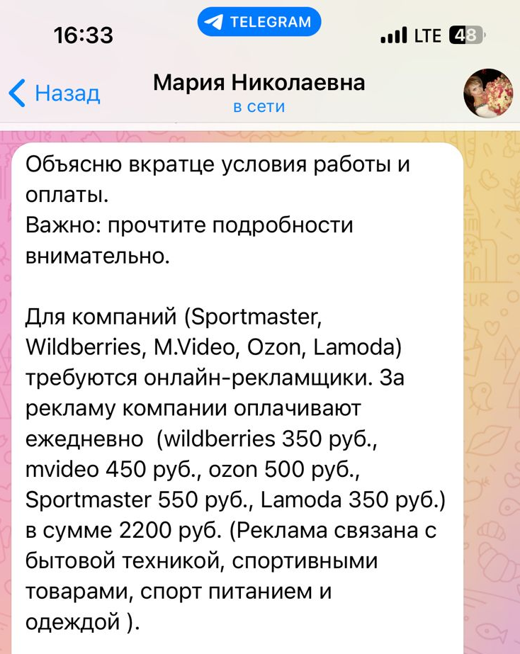 В ходе анализа деятельности VahrushevaMariia было установлено, что схема маскируется под простую подработку в онлайн-рекламе и обманывает людей. Мы выделили причины, по которым участие в проекте является опасным: