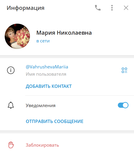 Контактные данные ограничиваются личным профилем в Телеграме под ником VahrushevaMariia. Через него ведется вся коммуникация с участниками схемы. Аккаунт не имеет привязки к официальному сайту, электронной почте или другим платформам. В профиле отсутствует номер телефона, электронная почта или другие идентификаторы.