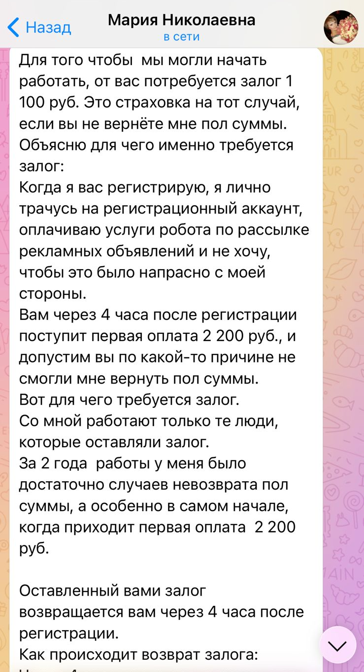 Однако обязательный залог в 1100 рублей становится потерей средств, так как после перевода на карту деятельница прекращает общение или требует дополнительные платежи под предлогом комиссий. Предоставляемые скриншоты выплат оказываются поддельными. Личные данные, которые были сорбаны на этапе регистрации, могут использоваться для продажи третьим лицам.